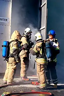 Firefighters wearing SCBA and protective gear about to enter a smoke-filled room during an exercise.