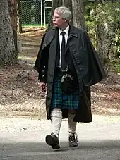 A man wearing a raincape and a kilt