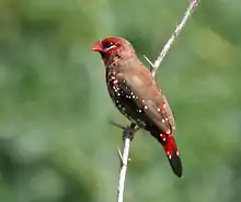 - An estrildid finch (Amandava amandava), of India and Southeast Asia, commonly kept and bred as a cagebird.