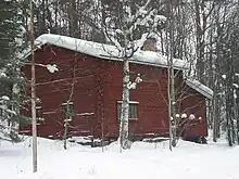 - (agriculture, historical) A traditional Scandinavian and Russian grain drying and threshing cabin, in which the grain was dried in the heat and smoke of a chimneyless stove and then threshed on the floor.