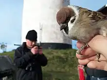 A Eurasian tree sparrow ringed during ringing at Landsort performed by Landsort Bird Observatory during autumn migration.