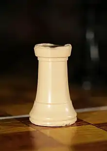 - (chess) A piece shaped like a castle tower, that can be moved only up, down, left or right (but not diagonally) or in castling.