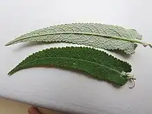 Leaves of Buddleja salviifolia have a dark-green, rugulose upper surface, with a rugose-veined lower surface, clad in a white indumentum.