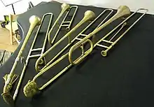 - (music) A brass instrument from the Renaissance and Baroque Eras, and an ancestor of the modern trombone. It was derived from the medieval slide trumpet.