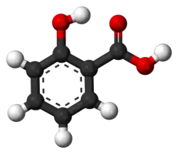 - (organic chemistry) A white crystalline organic acid, 2-hydroxybenzoic acid, C6>H4(OH)(COOH), used in the production of aspirin and other industrial chemicals.