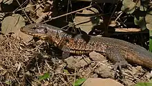 - 1919, William Beebe, quoting Edgar Beckett, “Field Notes on the Lizards of Kartabo, British Guiana, and Caripito, Venezuela. Part 3. Teiidae, Amphisbaenidae and Scincidae.”, in [Henry] Fairfield Osborn [Jr.], editor, Zoologica: Scientific Contributions of the New York Zoological Society, volume 30, part 1, New York, N.Y.: New York Zoological Society, published 27 April 1945, →OCLC, page 25, column 2: