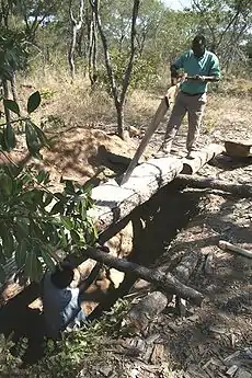 1. A pit over which lumber is positioned to be sawn with a long two-handled saw (a pitsaw) by two people, one standing above the timber and the other in the pit below.