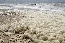 Phaeocystis globosa bloom washing ashore as foam (schuim).