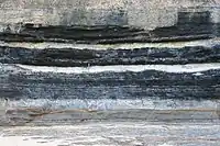 - (geology) A thin stratum, especially of an economically viable material such as coal or mineral.