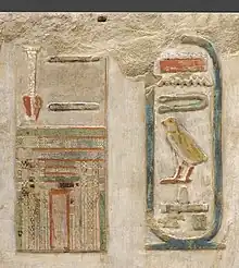 - In Egyptian hieroglyphs, a rectangular enclosure consisting of a depiction of a palace façade and a top-down view of a royal courtyard containing the Horus name of a pharaoh, usually topped by a Horus falcon.