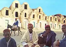 a Maghrebi brimless cap with a tassel and straight sides.