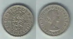 - (historical) A coin formerly used in the United Kingdom, Ireland, Malta, Australia, New Zealand and many other Commonwealth countries worth twelve old pence, or one twentieth of a pound sterling.