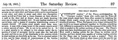 - "Constant readers" of the Times […] must have been often amused by watching the change which yearly comes over the great journal during the months of autumn. When Parliament is no longer sitting and the gay world is no longer gathered together in London, something very different is supposed to do for the remnant of the public from what is needed in the politer portions of the year. […] In the dead of autumn, when the second and third rate hands are on, we sink from nonsense written with a purpose to nonsense written because the writer must write either nonsense or nothing. We have, however, observed this year very strong symptoms of the Silly Season of 1861 setting in a month or two before its time.