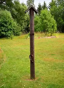- (historical) a pole (in a public place) meant for tying an offender to, subjecting them to public humiliation and sometimes physical punishment, similar to a pillory