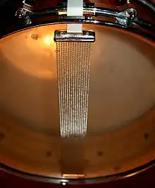 - (music) A set of stiff wires held under tension against the bottom head of a drum to create a rattling sound.