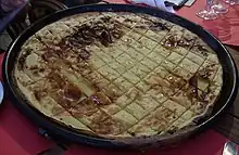 - A French dish popular in Nice; a kind of chickpea pancake seasoned and eaten hot.