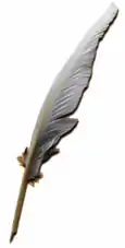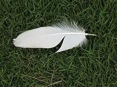 - feather (branching, hair-like structure that covers the skin of birds; a feather covering)