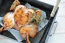 - (cooking, also attributively) Poultry which has been cut along the spine and spread out for more even cooking. [from late 18th c.]