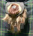 From Scottish Gaelic sporan (“purse”), from Middle Irish sparán, possibly from Late Latin bursa (“purse”), ultimately from Ancient Greek βύρσα (búrsa, “leather, hide”).