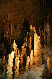 - (geology) A secondary mineral deposit of calcium carbonate or other mineral, in shapes similar to icicles, that lies on the ground of a cave.