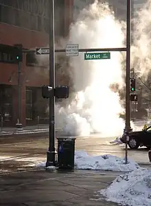 - The suspended condensate (cloud) formed by water vapour when it encounters colder air