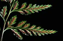De streepvormige sori van Asplenium adiantum-nigrum (zwartsteel).