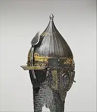 - (historical) lobster-tailed pot, zischägge (European combat helmet, worn especially from the 1600s into the 1700s, consisting of a rounded skull-piece, often cheek guards and a nasal or face-guard, and a laminated defence (or single plate ridged to imitate lames) to protect the back of the neck that resembled a lobster's tail)