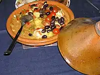 - (by extension) A stew, originally from Morocco, the ingredients of which are traditionally cooked slowly in such a pot; the dish is normally served with couscous.
