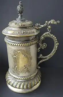 - A large drinking vessel, sometimes of pewter, sometimes with a glass base, with one handle and often a hinged cover.