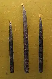 - A long, narrow cylindrical candle that narrows slightly from a wider base to a conical tip.