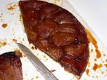 - A type of upside-down cake in which the fruit, usually apples, is caramelized in butter and sugar.