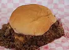 - (Upper Midwestern US) An Iowan sandwich consisting of unseasoned ground beef and sauteed onions in a bun.