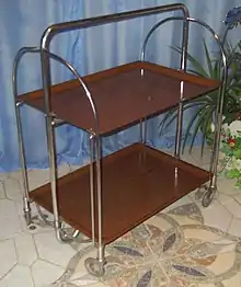 - (especially Commonwealth) A table on wheels used to take food or drinks from the kitchen to the dining-room, or throughout a workplace for tea break.