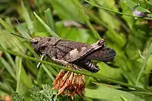 At rest the tegmen of this grasshopper covers the folded flight wings, which in fact are highly coloured and need camouflage