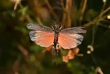 In flight the tegmina are not much used; they are held away, exposing the coloured flight wings in a sophisticated misdirection tactic.