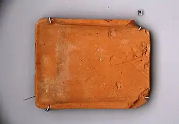 - (archaeology) A flat Roman roof tile with raised edges, joined together by an imbrex.