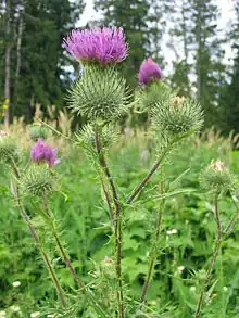 - Any of several perennial composite plants, especially of genera Cirsium, Carduus, Cynara, or Onopordum, having prickly leaves and showy flower heads with prickly bracts.