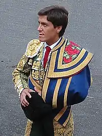 Antonio Barrera, a Spanish bullfighter, is dressed in a traje de luces with the ceremonial capote de paseo over his left arm and the montera in his right hand