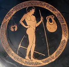 Gymnasium scene about 490 BCE, showing twibill (2) mattock used for loosening soil in the jumping pit