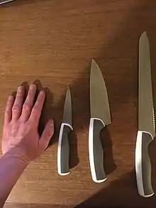 From left: hand for scale, urtekniv, grøn(t)sagskniv, bread knife.