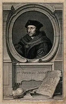 A 1741 engraving of the English lawyer, statesman, and author Sir Thomas More (1478–1535).[n 1] Having written the book Utopia (1516) about the political system of an imaginary, ideal island nation, Moore can be regarded as a utopographer.