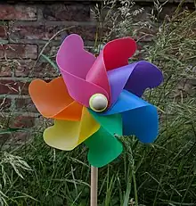 - pinwheel (toy: flower-like propeller attached to a stem; the flower spins round in the wind)