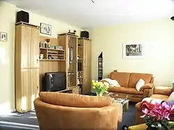 - living room, sitting room (room in a house where guests and visitors are received and entertained)