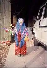 A child disguised as Easter witch, with decorated willow twigs in her right hand and a basket for collecting candy in the left.