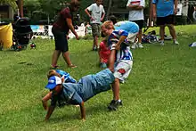 - A two-member team race in which one team member holds the legs of the other, as if the handles of a wheelbarrow. The team member playing the barrow runs on his/her hands.