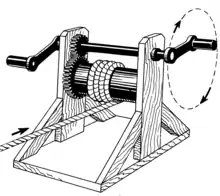 - A machine consisting of a drum on an axle, a friction brake or ratchet and pawl, and a crank handle or prime mover (often an electric or hydraulic motor), with or without gearing, to give increased mechanical advantage when hoisting or hauling on a rope or cable.