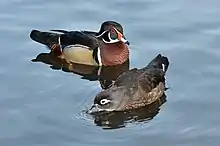 - A colorful North American duck, Aix sponsa, that nests in hollow trees.
