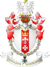A wreath, or torse, in argent (silver) and gules (red) lies between the top of the helmet, under the eagle.