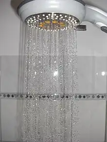 - shower (a device for bathing by which water is made to fall on the body from a height, either from a tank or by the action of a pump)
