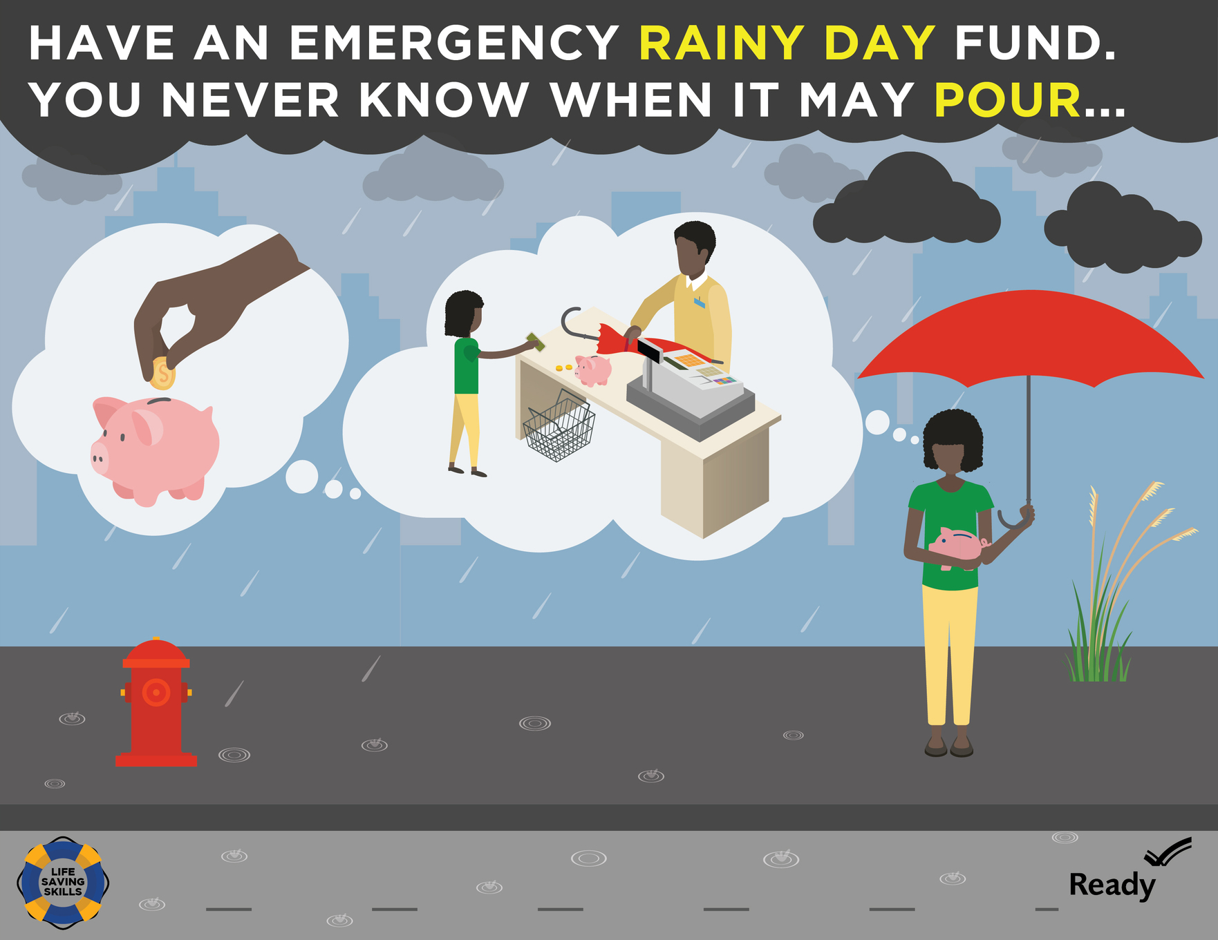 Illustration of a girl saving money in a piggy bank, then later using that money to buy an umbrella, then using that umbrella under the rain. Have an emergency rainy day fund. You never know when it may pour...